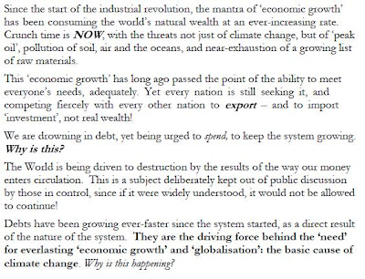 Tarkasteltaessa käsinkosketeltavia tosiasioita voimme todeta että pääongelma ei ole se että olisi puutetta tuotteista ja palveluista - vaan tuotteiden tuhlaaminen sekä niihin oikeuttavan rahan epäoikeudenmukainen jakelu. Velkojen jatkuvan kasvun johdosta näemme toivotonta taistelua työpaikoista toimeentulon ja velkojen hoitamisen vuoksi.