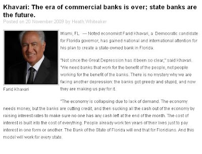 Floridan osavaltioss, USA:ssa on pian kuvernöörivaalit ja kuten olen aiemmin tuonut julki niin eräs kuvernööriehdokas Farid Khavari katsoo että yksityispankkien aikakausi on ohi - ja että kansanpankkina toimiminen kuuluu Floridan osavaltion - eli valtiovallan perustehtäviin.