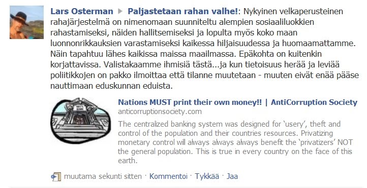 Ihmisten elämäntyö kuluu suurelta osin lainan korkoihin ja veroihin. Verot ovat pitkälti valtion ja muun julkisen vallan velkaantumisesta johtuvia turhia menoja. Julkinen valta puolestaan velkaantuu, koska joutuu lainaamaan kaiken käyttörahansa korollisesti liikepankeista. Velkaantumiskierre on tuhoamassa kaikki velkarahajärjestelmällä toimivat maat, myös Suomen.