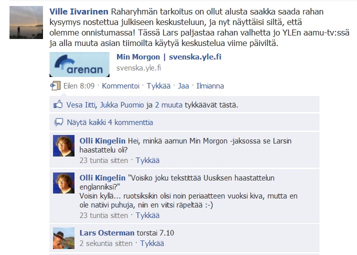 Kysyin Uusikselta rahasta, kuinka se luodaan ja kenen toimesta. Juttelimme vallan kulisseissa lymyävästä rahanvallasta, velkakriisistä ja poliittisten harhaanjohtajiemme älyttömistä toimista näiden ongelmien ratkaisemiseksi. Markku istuu hallituksen talousvaliokunnassa ja hänkin sanoo, että rahan ongelmien ratkaiseminen olisi naurettavan helppoa, mikäli vain tietoisuus nykyisen rahajärjestelmän todellisesta luonteesta leviäisi nykyistä laajemmalle.