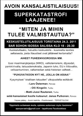 11.3. perjantaina alkoi superkatastrofi leviämään Japanissa. Maanjäristys, tsunami ja niistä seurannut ydintuho - maan tragedia on valtava, evakuoinnit ovat alkaneet. Kestääkö talous, säilyykö Japani - onko koko maailmantalous ajautumassa kaaokseen - mitä Japanissa oikein tapahtuu ja miten se vaikuttaa ihan kaikkeen?
